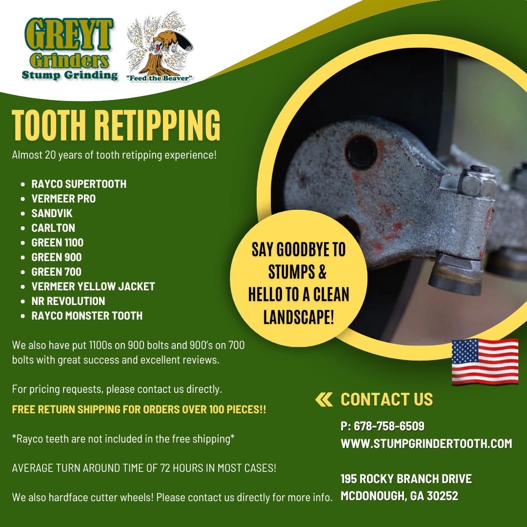 Need to replace or repair your stump grinder’s teeth? Check out our stump grinder tooth retipping services below.